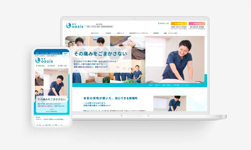 「なぜ整体oasisなら改善できるのか」を明確に伝すため、何度もヒアリングや打ち合わせを重ね、院の強みや価値を的確に言語化して表現に落とし込みました。