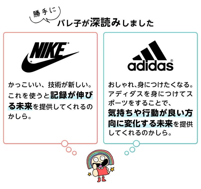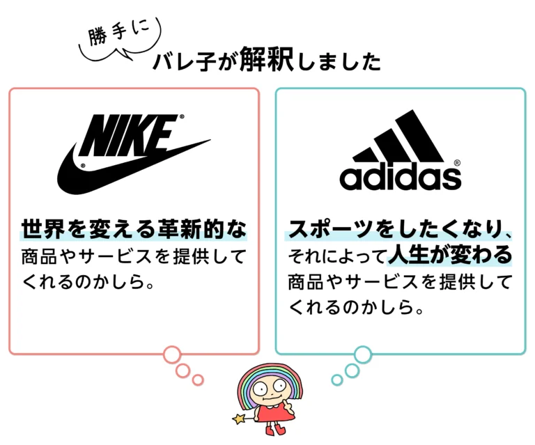 企業理念は、対外的・対内的に表明します。 あなたはナイキ、アディダスどちらの商品が欲しいですか?